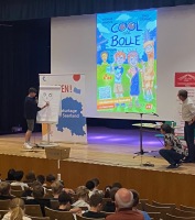 Das Besondere bei einer Lesung mit einem Illustrator — er kann mit den Kids schnellzeichnen üben. Doch zunächst überraschte er Edwin Didas vom HWG und Beatrice Schmitt von der Bücherhütte damit, dass er sie bat, an seiner Statt ausgewählte Textstellen zu lesen, damit er mit zwei freien Händen quasi „simultan” mit dem Flipchart auf der Bühne illustrieren konnte. Dann, beim Schnellzeichenkurs für alle, zeigte er den Schülern, wie man mit wenigen Strichen, ein wenig Anleitung und den richtigen Proportionen zeichnen kann — alle waren sofort mit Feuereifer dabei. Was dabei wohl herauskam? Ja, genau, im Buch „Cool wie Bolle” gibt es Zwillinge und ein Haustier namens „Spucki”, ein Alpaka, genau dieses Alpaka konnten nach der Lesung alle zeichnen.