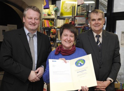 ![]() Auch 2013 sind wir anerkannter Lesepartner!Anfang des Jahres erhielten wir bereits zum dritten Mal zusammen mit anderen saarländischen Buchhandlungen das Gütesiegel „Netzwerk Mehr Lesen – Anerkannter Lesepartner”. Diese Auszeichnung wird vom Ministerium und vom Landesverband Saar des Börsenvereins des deutschen Buchhandels an Buchhandlungen verliehen, die sich in besonderer Weise um die Leseförderung verdient gemacht haben. ![]() Was hier in Wadern besondere Erwähnung fand? Na, der Schreibwettbewerb, den wir in Zusammenarbeit mir der Stadt, Kultur am Tor und dem Jugendbüro im Rahmen der Waderner Buchwoche veranstalten. Dazu Aktionen und Führungen für Schulklassen zum Welttag des Buches. Natürlich sind in unserem Laden eigene Bereiche für Kinder- und Jugendbücher wichtig. Minister Commercon gratulierte im Rahmen einer Feierstunde in Saarbrücken jeder Buchhandlung persönlich, natürlich auch uns :-) — , auf dem Photo zusammen mit Buchhändlerin Beatrice Schmitt und Klaus Feld vom Landesverband Saarland.  |