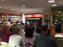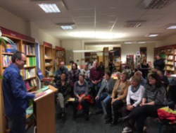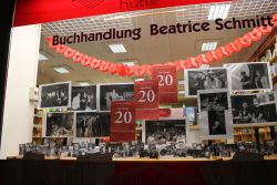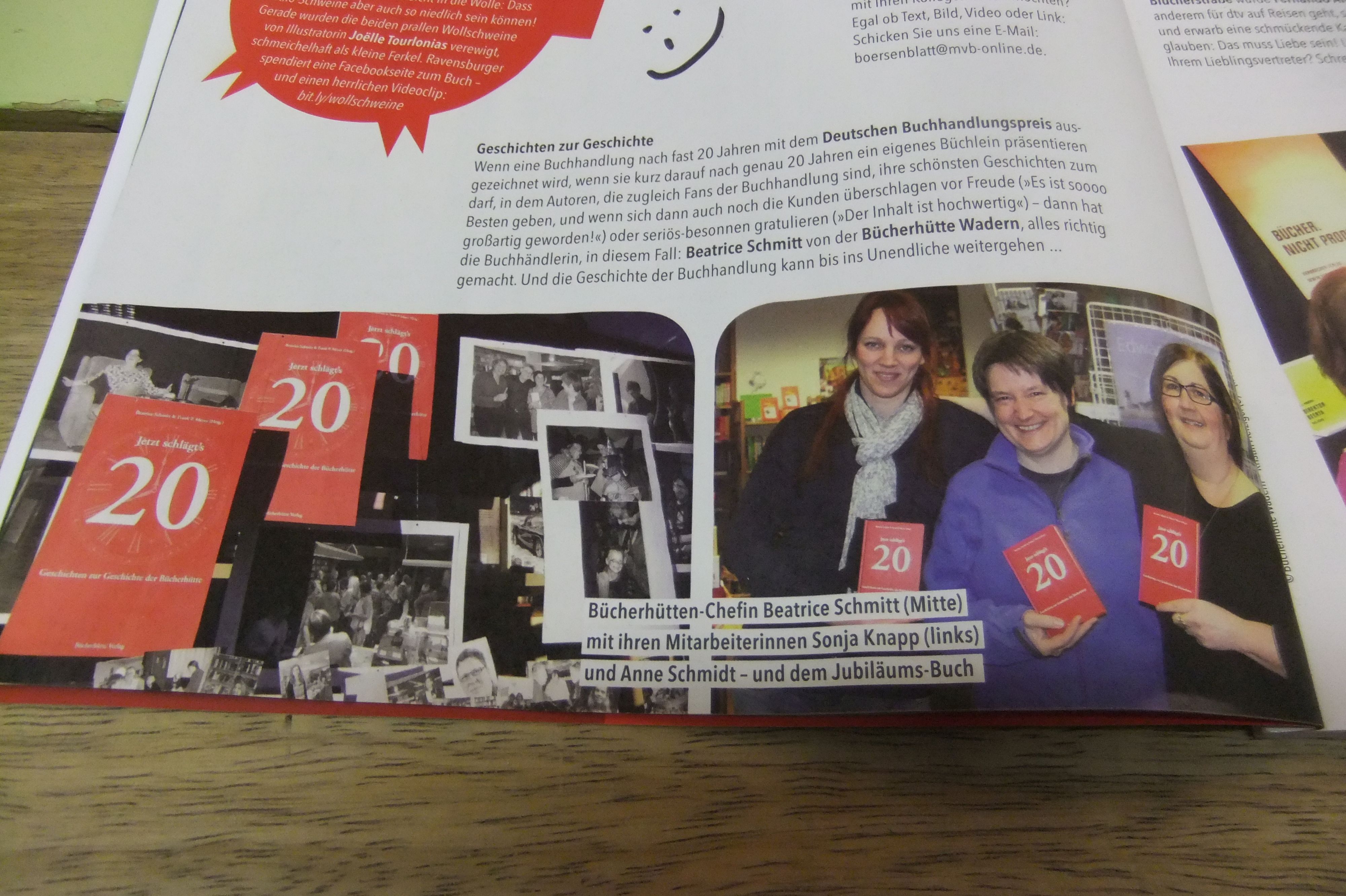 So sieht es aus, unser Büchlein zu 20 Jahren Bücherhütte, mit 20 tollen „Lieferanten”, herausgegeben von Frank P. Meyer und Beatrice Schmitt, gedruckt bei den Nachbarn in der Waderner Druckerei, mit ISBN des Bücherhütte Verlags von Thomas Schmitt in Rockenhausen. Und wieso es „20 schlägt”, das hat auch mit unserer benachbarten Kirche und den Kirchturmglocken zu tun, aber das erschließt sich beim Lesen. Fest steht, die Sammlung ist soooo schön geworden, von innen und außen, hinreißende, kurze Geschichten, Krimis, Ideen... Ein großes Dankeschön an alle Autorinnen und Autoren! Und dann haben wir eingeladen und ganz viele kamen: Auf den Tag 20 Jahre nach der „Neueröffnung” der Bücherhütte am 6. Januar 1997 luden wir am Freitag, 6. Januar 2017, auf ein Glas Sekt ein. Und haben mit unseren Gästen gefeiert, uns bei allen Kunden für Ihre Treue bedankt. Als erster Highlight gab's einen sehr schönen Artikel in der SZ. Und dann haben wir's auch noch ins Börsenblatt des Deutschen Buchhandels geschafft! Die Krönung kam im Februar: Erst im BuchMarkt ein wunderbarer Artikel über uns von Susanna Wengeler — sehr, sehr toll, dankeschön! — und dann am 19.2. auf SR3 in der Region am Sonntag ein sehr, sehr schöner Beitrag zur Bücherhütte und ihren Kundinnen von Lisa Huth. Ein weiterer Glanzlicht, finden wir, ist unser Jubel-Schaufenster — da sind 20 Jahre Bücherhütte drin, ganz viele tolle Photos, ganz viel zum Entdecken und Wiederentdecken! Und damit das ohne Lupe geht, klicken Sie einfach auf das kleine Bild :-). Und am Fastnachtsdienstag haben wir eine Lesung aus UNSEREM Buch veranstaltet — und es war ein richtig schöner Abend, wie die Bilder zeigen.  |