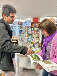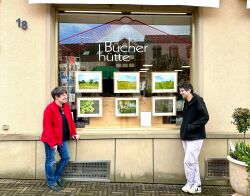 Kunstroute Wadern 2024Zur traditionellen Kunstroute Wadern am Palmsonntag hatten wir in diesem Jahr Miguel Nunes bei uns zu Gast. Ein weitgereister Gast, denn er wurde in Madeira geboren, aber zugegeben, er wohnt in Luxemburg. Und ist außerdem ein gern gesehener Wochenend-Besucher in Wadern. So hat es perfekt gepasst mit seiner künstlerischen Arbeit und unserer Kunstroute in Wadern. Miguel stellte in unserem Schaufenster tolle Fotografien des (beinahe schon in Vergessenheit geratenen) Lichthardter Weihers aus und präsentierte drinnen in der Bücherhütte sein bemerkenswertes Buch-Projekt „Zurück zum See”. Den interessierten Gästen erzählte er — völlig international, denn wahlweise in englisch, französisch, luxemburgisch oder portugiesisch — von seinen Ideen, seiner Arbeit und seiner Berufung. Und von der spannenden Entstehungsgeschichte des aus hochwertigen Materialien zusammengestellten und in mühevoller Handarbeit selbst gebundenen Buches. Ein Exemplar aus der limitierten Auflage hat er uns dagelassen, zum Reinblättern und Genießen oder auch zum käuflichen Erwerb, mit Echtheitszertifikat, persönlicher Signatur und Numerierung. |