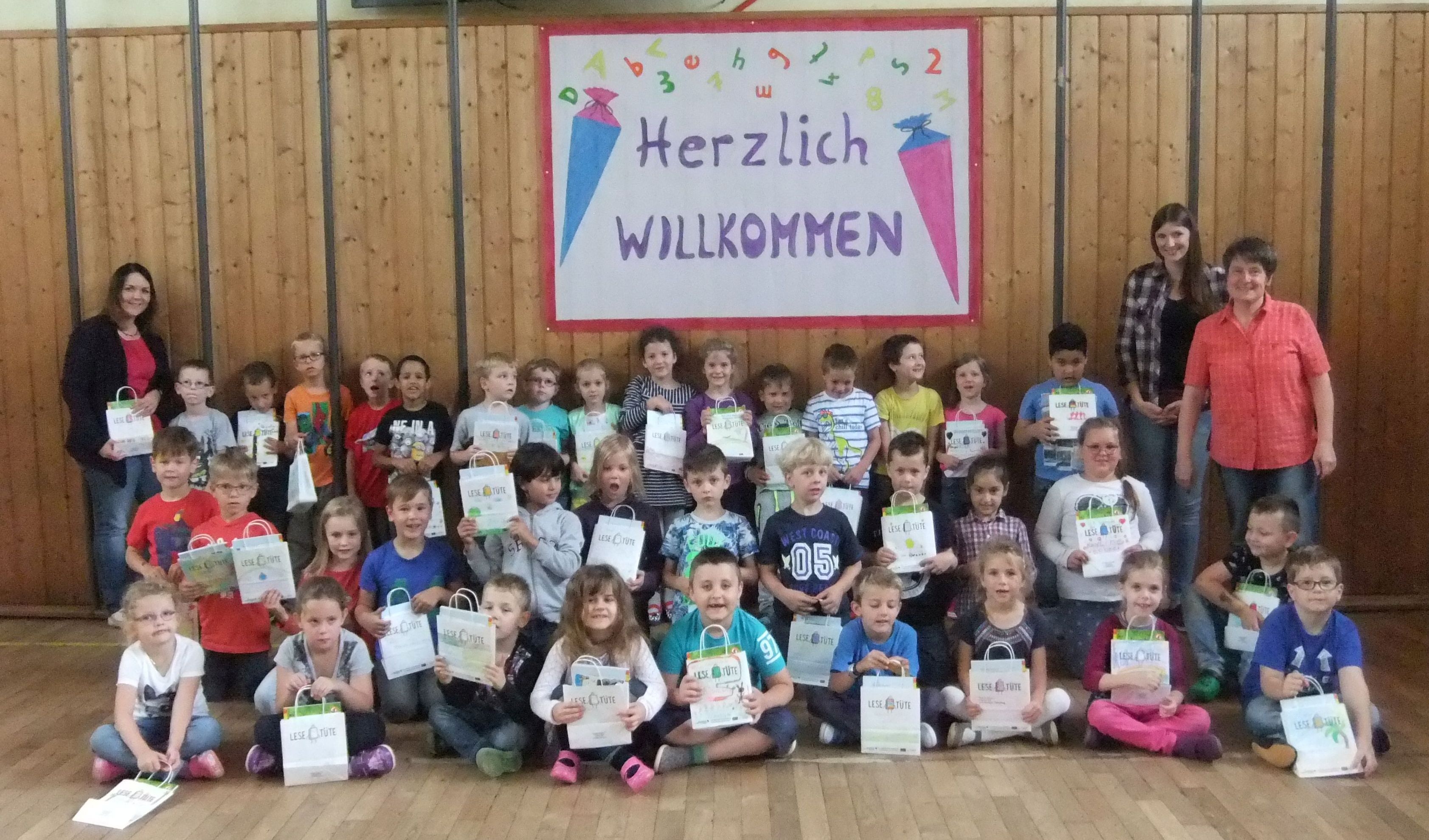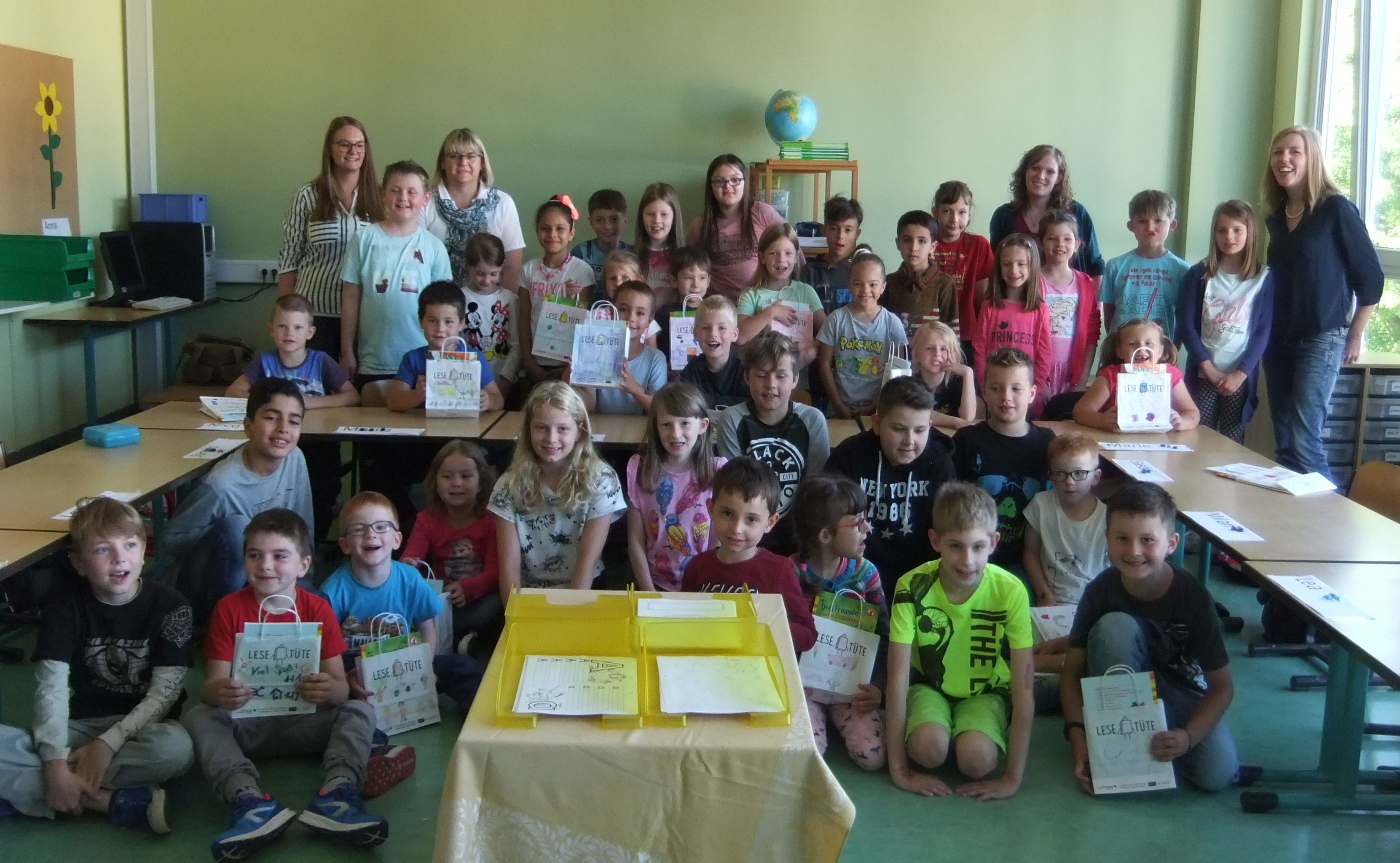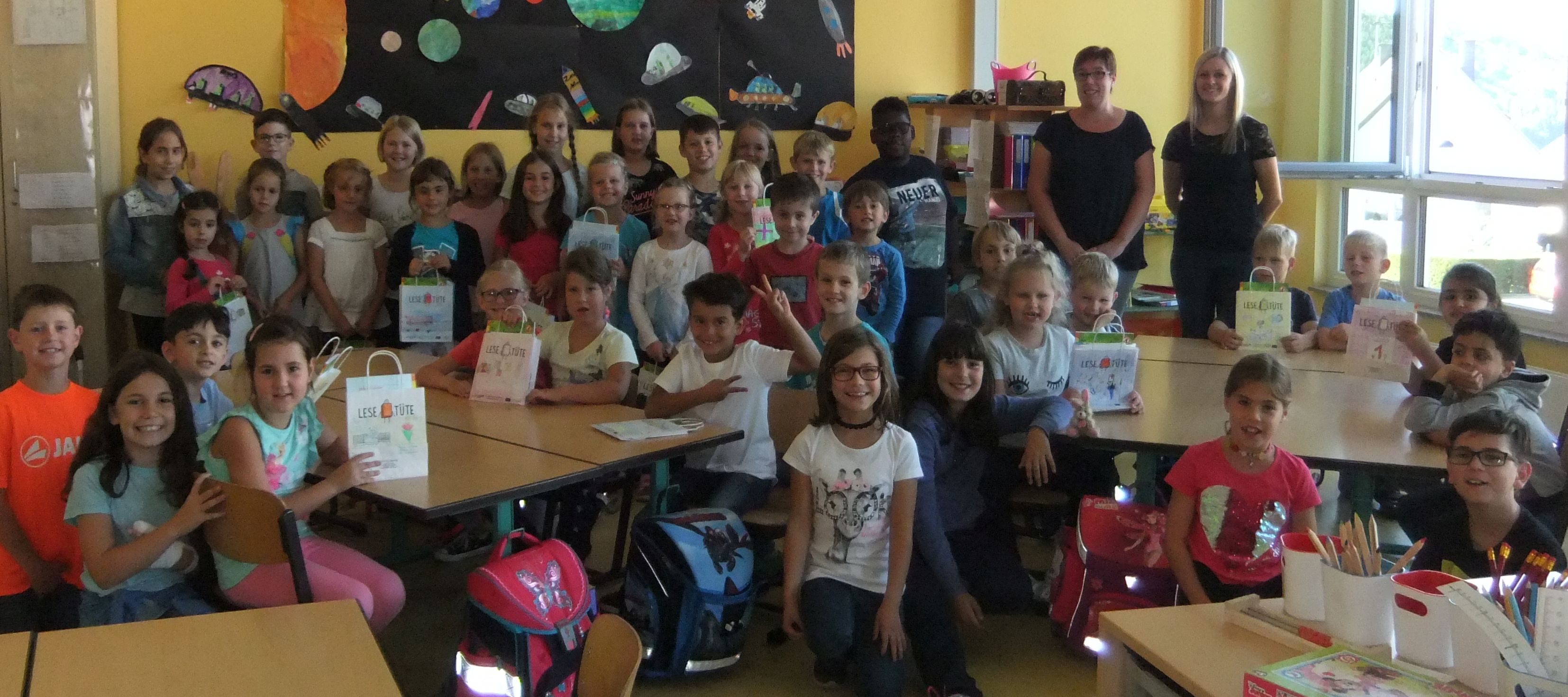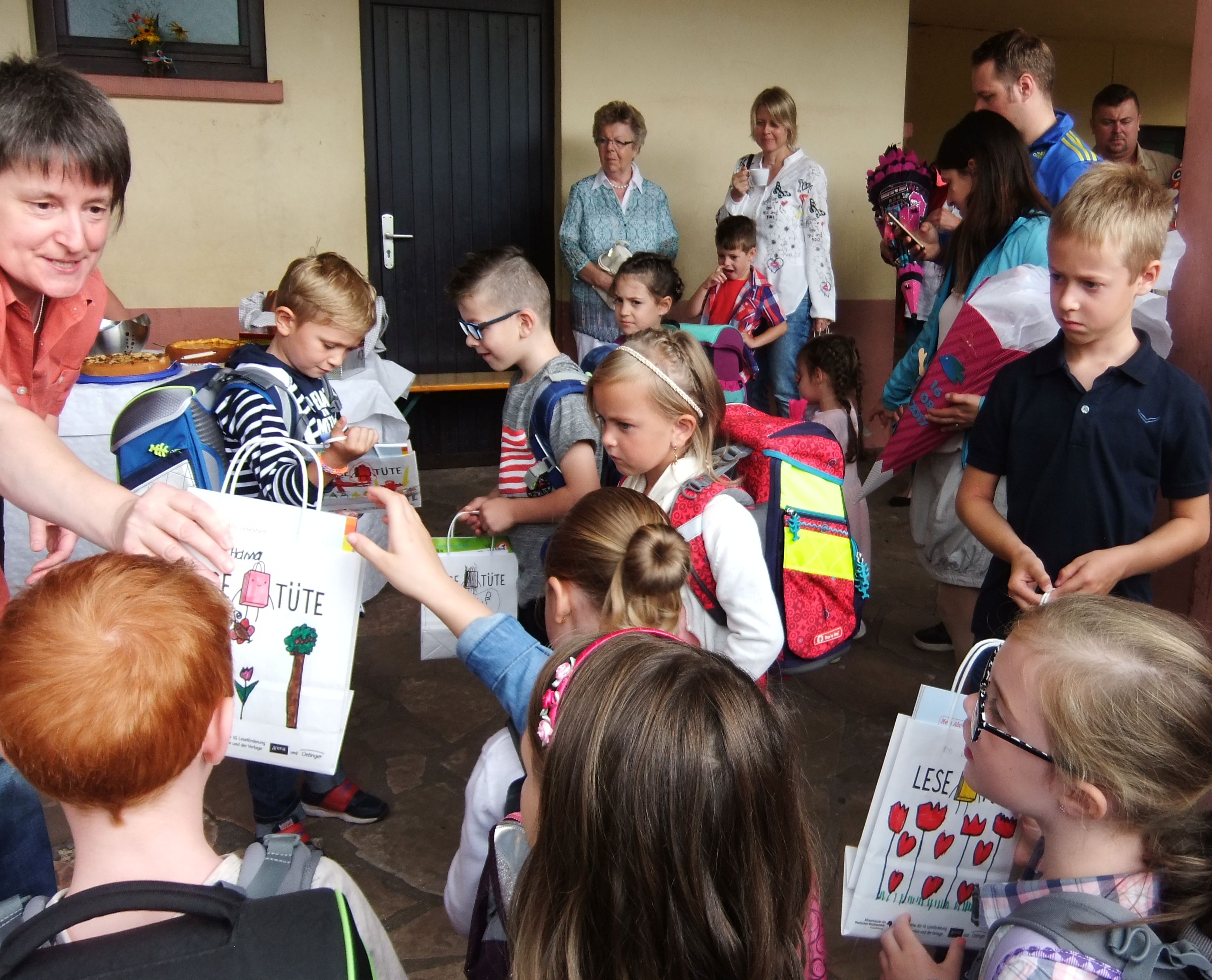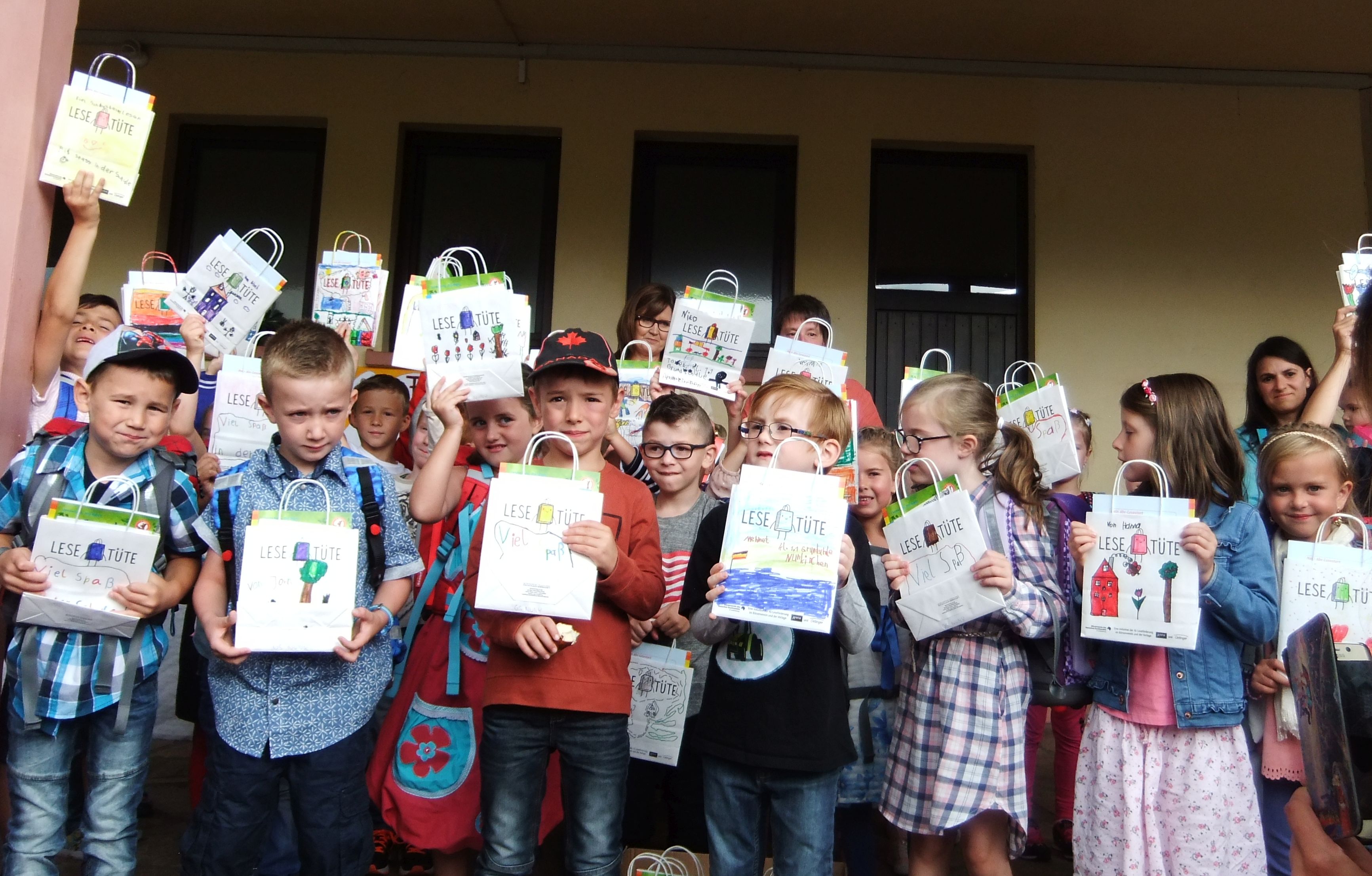 Aktion „Eine bunte Lesetüte für jeden Schulanfänger”Zum zweiten Mal waren wir dabei bei der Lesetüten-Aktion. Vor den Ferien im Sommer 2017 wurden sie von den älteren Grundschulkindern bemalt, in den Ferien haben wir sie im Schaufenster dekoriert, sah wieder klasse aus und gab tolle Kommentare. Und dann haben wir sie in der ersten Schulwoche an die neuen Erstklässler der Grundschulen Nunkirchen-Bardenbach, Lockweiler und Wadrill-Steinberg verschenkt. In Lockweiler durften sogar die Original-Künstler, das sind die Paten der Erstklässler aus der 4. Klasse, persönlich überreichen und kamen mit aufs Photo. Wenn das Bild zu klein ist, klocken Sie einfach drauf — dann können Sie es in gross bewundern. Es war wieder eine sehr schöne Aktion! Danke an alle, die dazu beigetragen haben, Schüler, Lehrerinnen und SchulleiterInnen! Und dann gab's auch noch nen tollen Artikel in der Saarbrücker Zeitung. Dankeschön an die SZ!  |