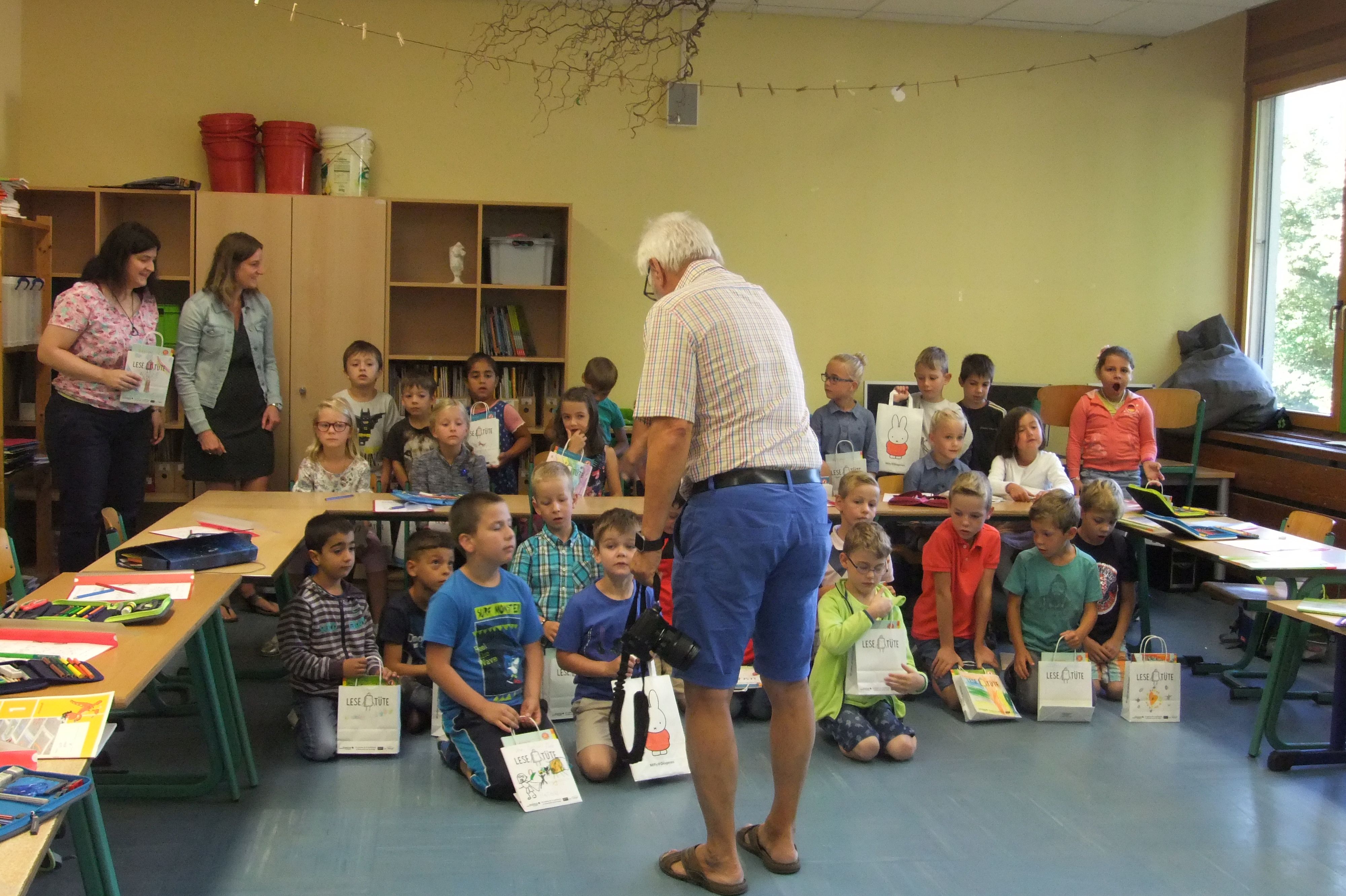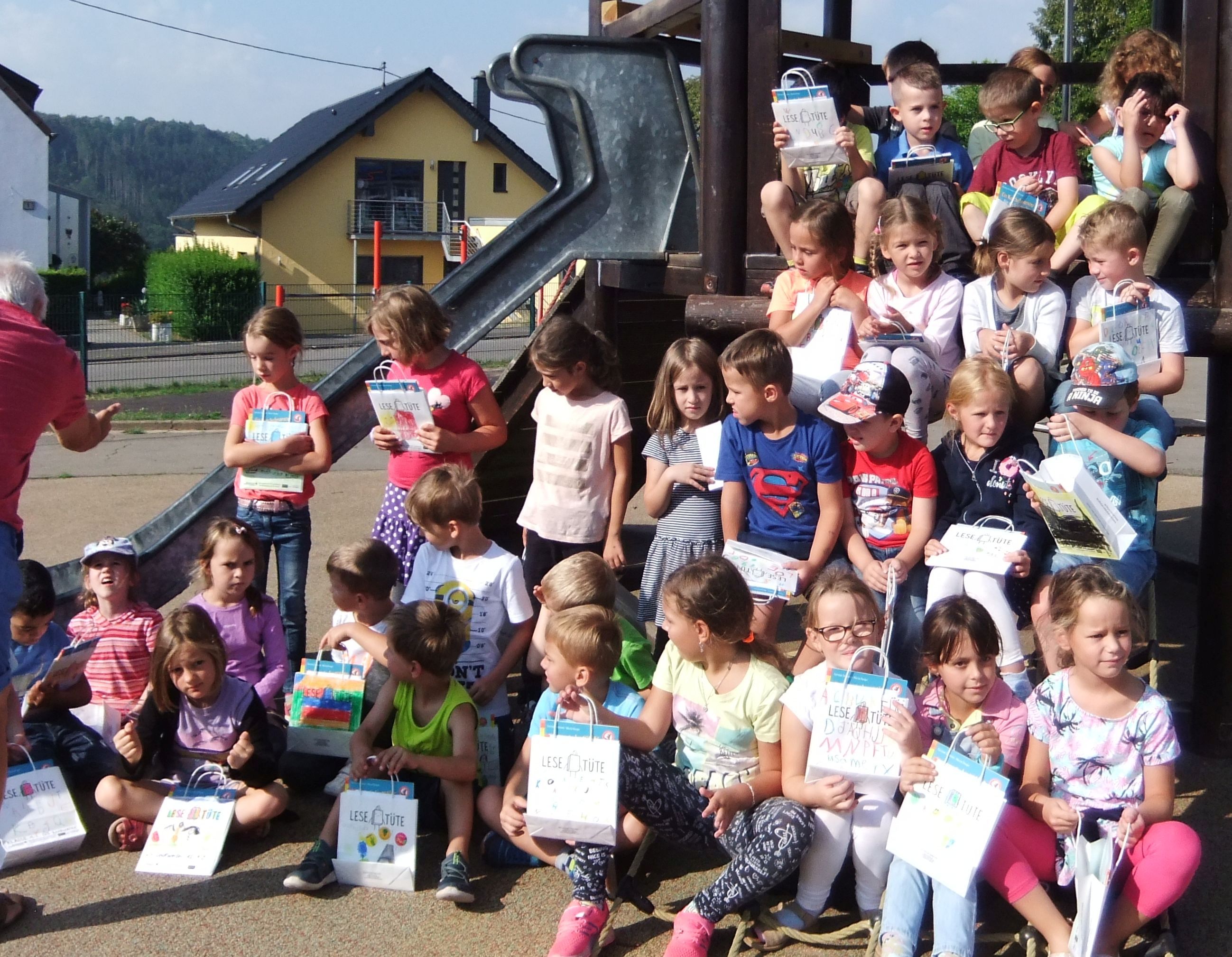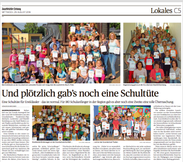 Lesetüten-Aktion für SchulanfängerDie Lesetüten-Aktion für Schulanfänger hatten wir ja schon im Schaufenster. So schön in ihrer Vielfalt und so liebevoll gestaltet waren sie von den jetzigen Erstklässlern, dass unsere Kunden welche davon kaufen wollten. Haben wir aber natürlich nicht gestattet, wir haben sie verteidigt und wie geplant gefüllt: Mit Erstlesebuch und Stundenplan und Lesezeichen und dann haben wir sie zu den Erstklässlern in alle vier beteiligten Schulen gebracht. Nach Nunkirchen, nach Lockweiler, nach Wadrill und nach Weiskirchen, sprich: Nach Thailen und Konfeld. Und dort haben wir jedem und jeder ErstklässlerIn eine Tüte geschenkt und schöne Photos gemacht. Und, was vielleicht am allerschönsten war, die Saarbrücker Zeitung hat einen tollen Bericht darüber gedruckt — der ist hier. Na dann, liebe ErstklässlerInnen - Alles Gute zum Schulstart!! Und wenn Ihr auf die Bilder klickt, könnt Ihr sie groß sehen!  |