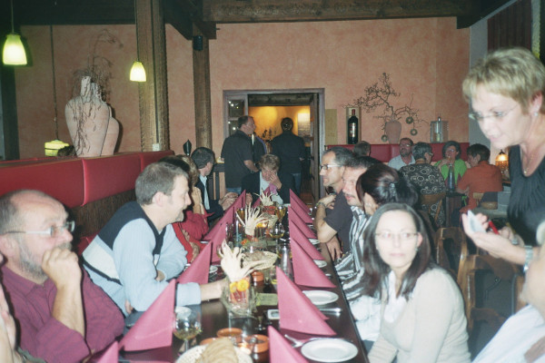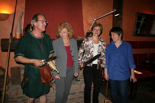 „Das Geheimnis des Mithras-Tempels” mit Karola Hagemann und Ilka StitzLesereise zum Abschluß der Bücherhwoche 2007Wie in den vergangenen Jahren bildete ein besonderer kulinarisch-kultureller Abend den Abschluss für die Waderner Buchwoche. Nachdem schon Saarlandkrimis, Weinkrimis und irische Geschichten im Mittelpunkt gestanden hatten, begaben sich das Autorinnenduo Hagemann & Stitz, der „Sklave Jatros” und die Gäste im Restaurant Autre Chose in Wadern auf eine „antike Lesereise” in das römisch besetzte Germanien im zweiten Jahrhundert nach Christus. Passend zur Intrigen- und Mordgeschichte, die der römische Tribun Quintilianus im historischen Krimi „Das Geheimnis des Mithras-Tempel” aufzuklären hatte, verwickelte der „Sklave Jatros” alias Günter Wolff die Zuhörer in römische Geschichten und Anekdoten. Dabei wanderten Schwerter, Helme, Münzen und Medicusbesteck von Tisch zu Tisch, die Speisenfolge vom Panis militaris, dem Legionärsbrot, bis zum Lenticulum, einem Linsengericht mit Reh, wurde bildreich kommentiert und es entwickelte sich ein improvisierter „historischer” Dialog zwischen den Autorinnen Ilka Stitz und Carola Hagemann und dem selbst ernannten „Erlebnissklaven” der Villa Borg. Bereichert durch neue Geschmackserfahrungen und einen bildreichen Geschichtsunterricht ließen es sich viele Gäste nicht nehmen, einen persönlich signierten Historienkrimi für die dunkle Jahreszeit mit Nachhause zu nehmen. Ein wichtiger Hinweis für die vielen Stammgäste der Veranstaltung: die Organisatoren des Abends, das Kulturamt der Stadt Wadern und die Bücherhütte Wadern, wälzen schon jetzt die „Reiseführer” für eine erlebnisreiche Lesereise 2008.  |