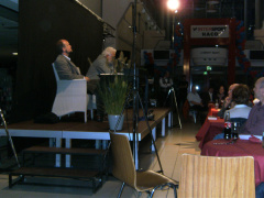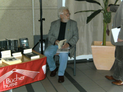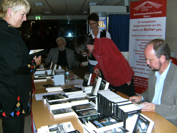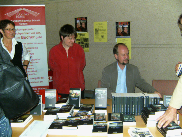 Die Wortspiele der KrimiautorenJacques Berndorf und Ralf Kramp unterhielten rund 150 Gäste in der Haco-GalerieWas man alles aus den beiden Worten „dichter” und Nebel” machen kann. Dichter Nebel steht für eine Wand aus Wassertröpfchen, die jede Sicht versperrt. Dichter Nebel ist auch ein ziemlich einfach gestrickter Mensch aus einem kleinen Dorf in der Eifel. Dichter Nebel in der Kneipe sagt aber auch aus, dass der Dichter Nebel ziemlich betrunken ist. Der Krimiautor Ralf Kramp spielt mit Worten. Und das zur Freude der Zuhörer. Ralf Kramp und Jacques Berndorf sind am Samstagabend im Haco-Einkaufszentrum in Wadern zu Gast. Die Galerie des Kaufhauses, durch die um 18.15 Uhr noch die die letzten Kunden eilig ihre Einkaufswagen geschoben haben, hat sich gut eine Stunde später in eine Kulturstätte verwandelt. „Eifeler Blut und deftige Hausmannskost—Eifelkrimi-Abend” lautet das Motto zur Eröffnung der Waderner Buchwoche. Dass Mord und Totschlag so viel Spaß machen, dass man herzlich lachen kann, das beweist Ralf Kramp mit seinen Kurzgeschichten, mit seinem schwarzen Humor und überraschenden Wendungen. Dabei liest er nicht nur, er verleiht seinen Figuren Leben, redet wie die alte Oma oder der betrunkene Dichter. Jacques Berndorfs tiefere, rauchige Stimme bildet da einen guten Kontrast. Auch Berndorf startet mit einer Kurzgeschichte über einen Tresorknacker und einem lustigen Ende. Und liest dann Passagen aus seinem Krimi „Mond über der Eifel”. Da plaudert ein Amulett- Hersteller offen darüber, wie er seine Kundschaft ausnimmt. Da will der Verein der Freunde des Mondes eine Mordserie aufgeklärt haben. Da erlaubt der Autor auch einen Blick in das Seelenleben von Ermittlern. Berndorf: „Der Ermittler, der zerbricht, ist ziemlich häufig.” Mit rund 150 Besuchern ist der Eifelkrimi-Abend ausverkauft. Rote Tischdecken, Kerzenschein, warmes Licht und die gewölbte Glasfassade, die Galerie des Einkaufszentrums ist wie geschaffen für solche Veranstaltungen. Die Gäste erhalten neben den Lesehäppchen auch Hausmannskost. Denn zwischen den einzelnen Vorträgen gibt es einen deftigen Wirsing-Möhren-Eintopf, genannt Pitter und Jupp, und als Dessert Obstsalat, Sahne-Creme und Aachener Schokoladen- Printen. Die Printen als dezenter Hinweis auf Weihnachten? Könnte man meinen. Denn die Bücher der beiden Autoren am Stand der Bücherhütte werden reichlich nachgefragt. Berndorf und Kramp versehen diese gerne mit Widmungen. Dass die Bücher aber als Weihnachtsgeschenke gedacht sind, ist eine Mär. Dafür hat dieser Krimiabend zu viel Lesehunger gemacht. Artikel verfaßt von Volker Fuchs. Abdruck mit freundlicher Genehmigung der Saarbrücker Zeitung.