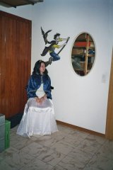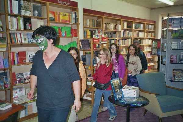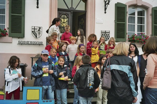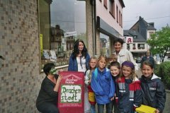 Literarische Stadtrallye am 19. September 2006Auf den Spuren von Jim KnopfAm 19. September eilten Schüler der 3. und 4. Klasse der Grundschule Löstertal durch Wadern. Alle waren mit Feuereifer dabei, als der Halbdrache Nepomuk 6 Gruppen mit je 6 Kindern in der Drachenstadt (auch bekannt als Bücherhütte) herum führte. Nepomuks Vater ist ein Drache, die Mutter ein Nilpferd - und wie jedes Kind (und manche Erwachsene) aus Jim Knopf wissen, ist er ein recht netter Halbdrache. Er führte die Kids unbeschadet zur Höhle des bösen Drachen Frau Mahlzahn. Dort traute er sich dann aber doch nicht hinein, es war ihm zu dunkel und unheimlich (das Beweisphoto unten ist mit Blitz aufgenommen, und wirkt deshalb weniger dunkel und unheimlich), aber die Kinder trauten sich natürlich und befreiten die darin gefangene und gefesselte Prinzessin Li-si. Vorher aber ging es über mehrere Stationen vom König Alfons-dem-viertel-vor-zwölften über Frau Waas bis zu Herrn Ärmel auf einer Schnitzeljagd quer durch Wadern auf den Spuren von Jim und Lukas dem Lokomotivföhrer. Alle fanden den Weg und kamen an, mit super Lösungen zu allen Rätseln. Alle waren begeistert (vor allem Halbdrache Nepomuk), und so wird es eine ähnliche Veranstaltung auch nächstes Jahr wieder geben.