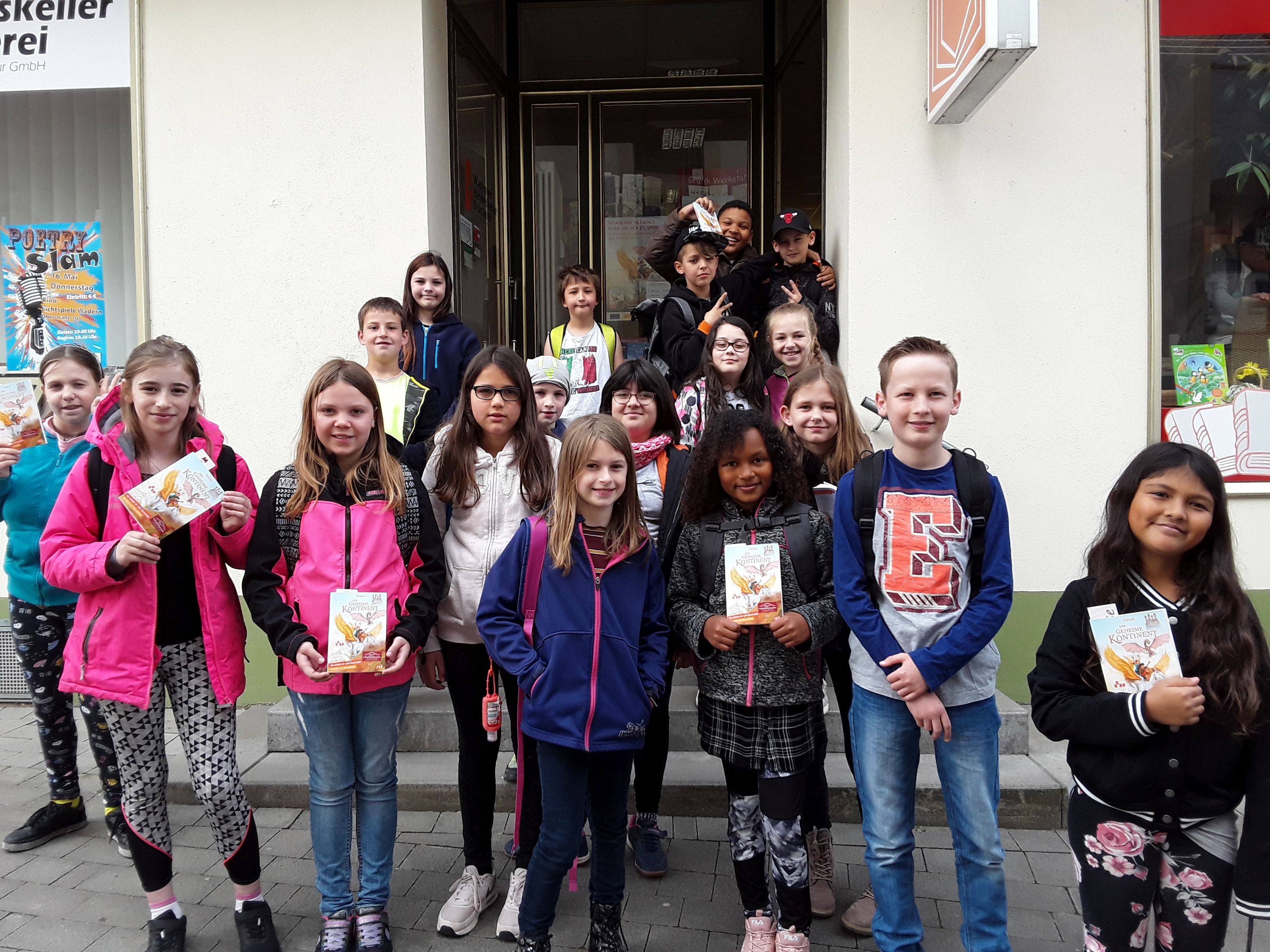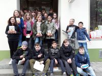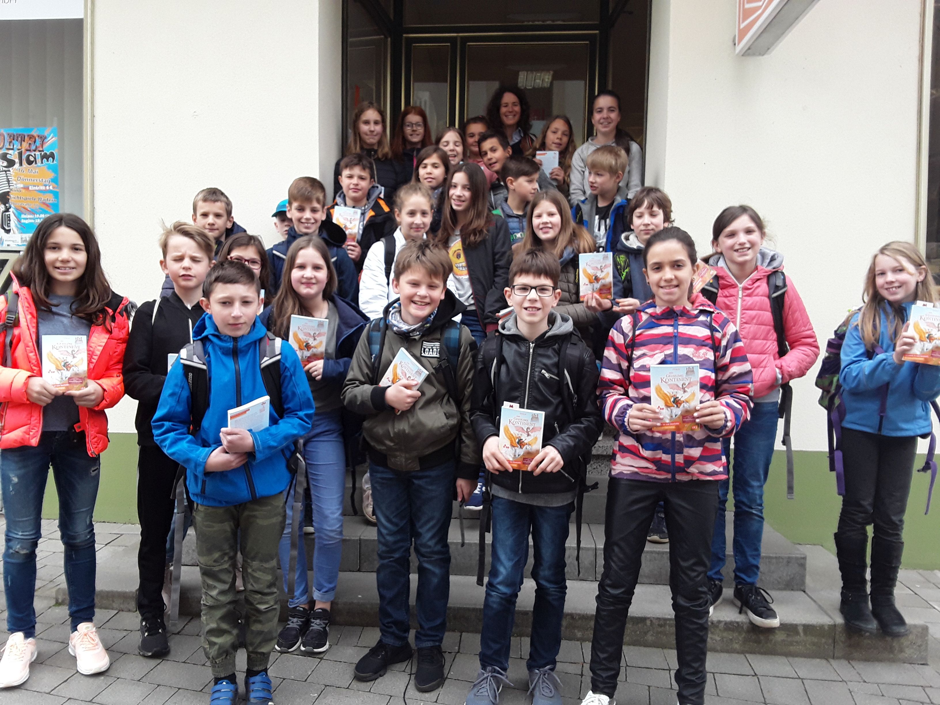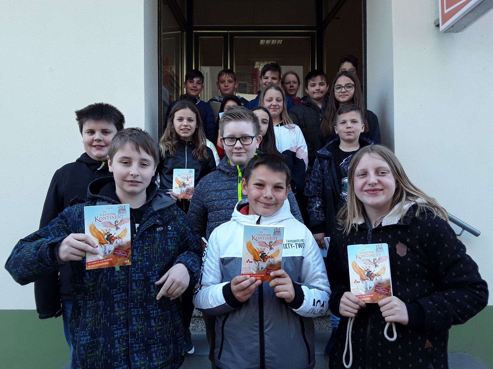 Welttag des BuchesWie seit Jahren hatten wir viele aufmerksame Klassen zu Gast, mit vielen Fragen und Antworten zu Büchern, zum Lesen, zu Buchpreisen und und und. Zum krönenden Abschluss gab es für die meisten eine kleine Stadt-Rallye mit Quiz und danach für jede Schülerin und jeden Schüler (und die LehrerInnen) das Buch „Ich schenk dir eine Geschichte” als Geschenk. Und dann noch draußen auf der Treppe ein Erinnerungsphoto für uns und bei manchen auch eines für unsere Homepage, Ihr hier jedenfalls habt es erlaubt :). Und wenn Ihr auf Euer Bild klickt, könnt Ihr es in größer anschauen.  |